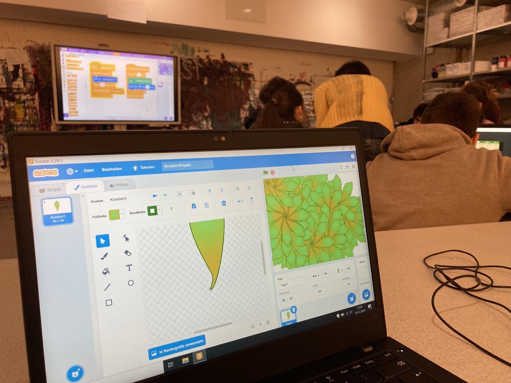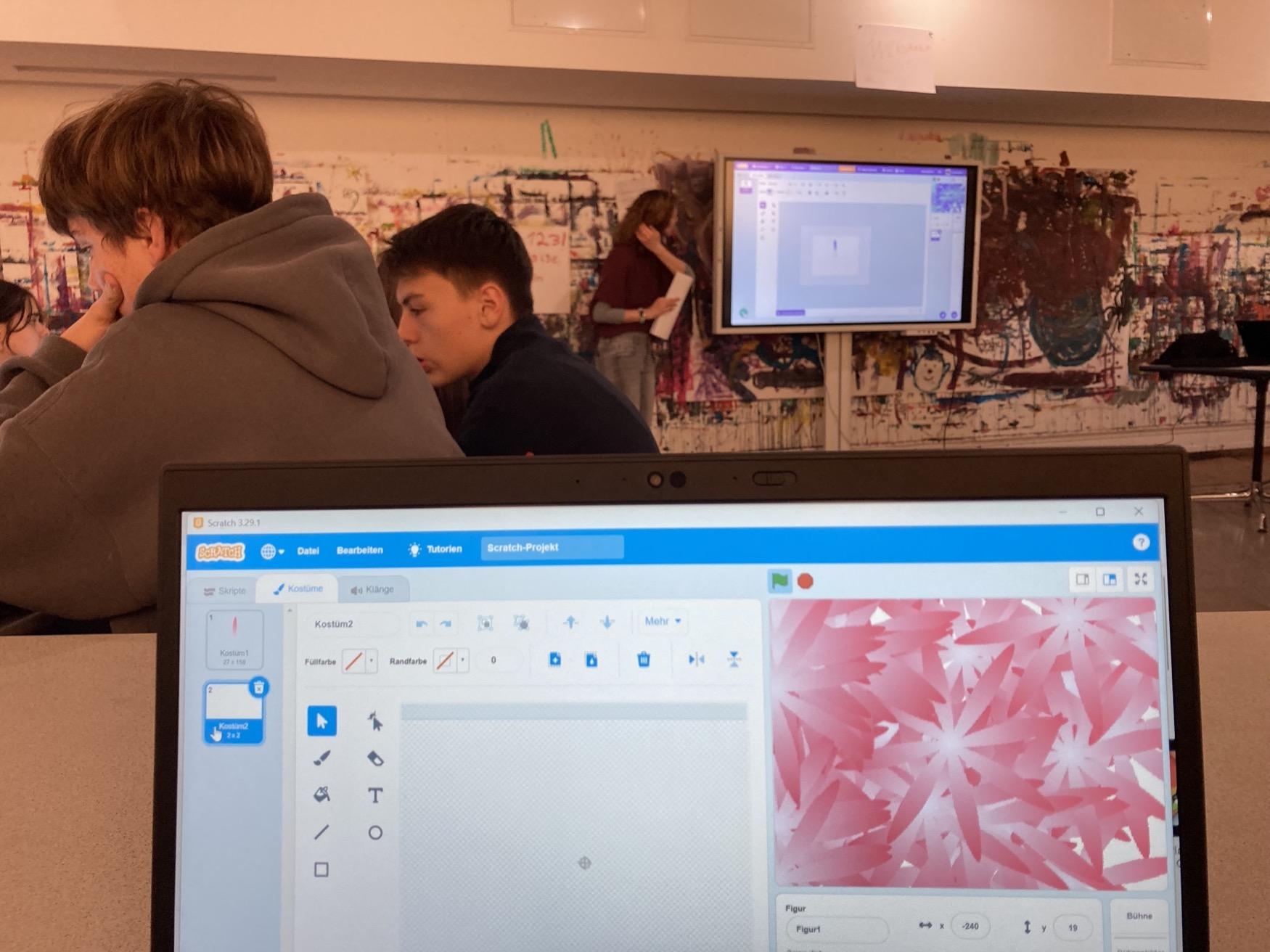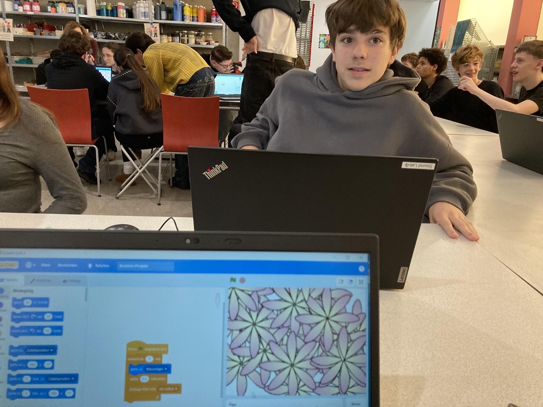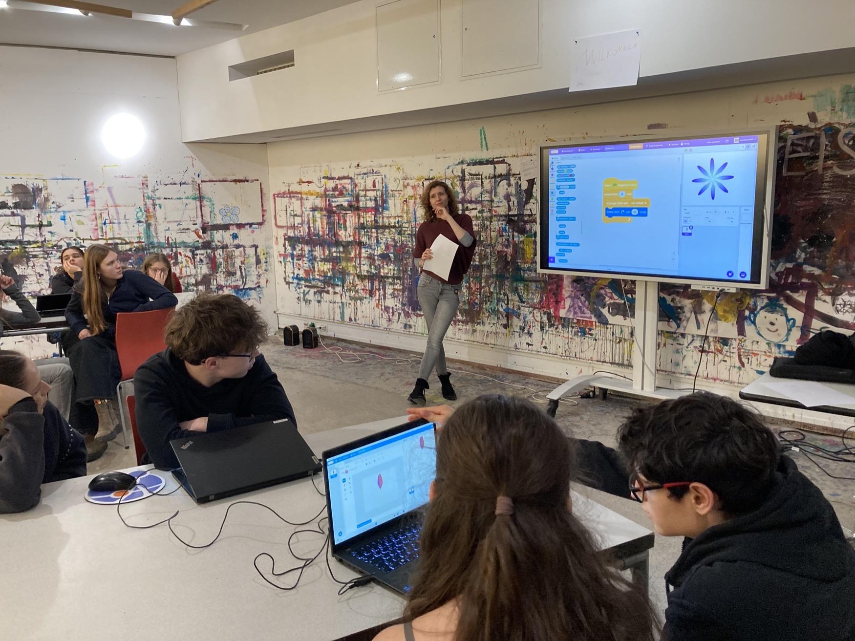 Warhol wählte mit den Flowers ein geradezu schlichtes Motiv und stellte doch große Fragen nach Serialität, Reproduktion, Vergänglichkeit. Im Workshop haben wir diese Ideen in die digitale Bildproduktion übertragen: Die Schüler*innen programmierten in Scratch einen Pinsel, der Blumen auf den Bildschirm „druckt“. Ein Vorgang, der streng seriell und überraschend verschieden zur selben Zeit sein kann. Nebenbei sprachen wir über Urheberrecht, Medien- und Remix-Kultur.