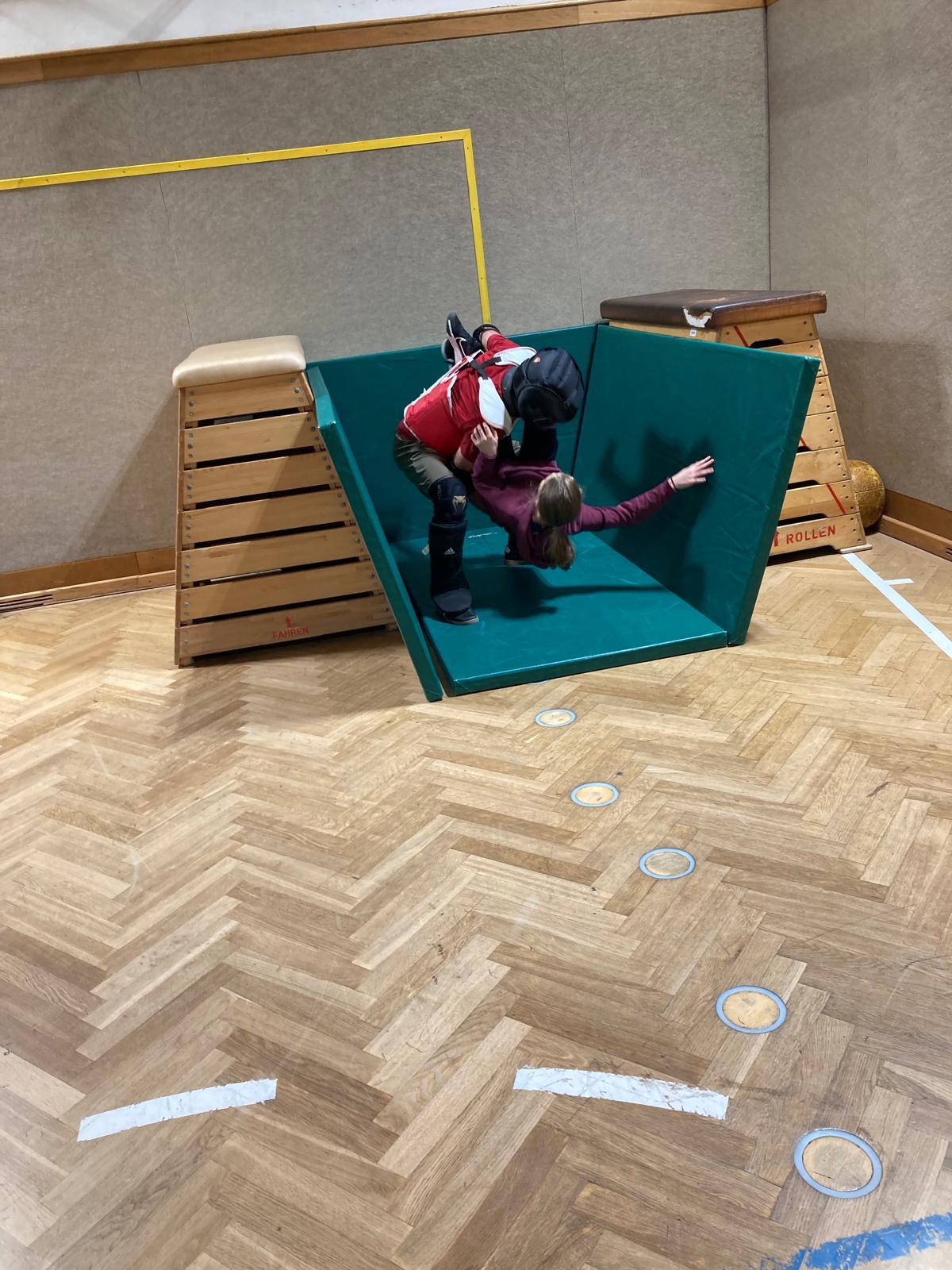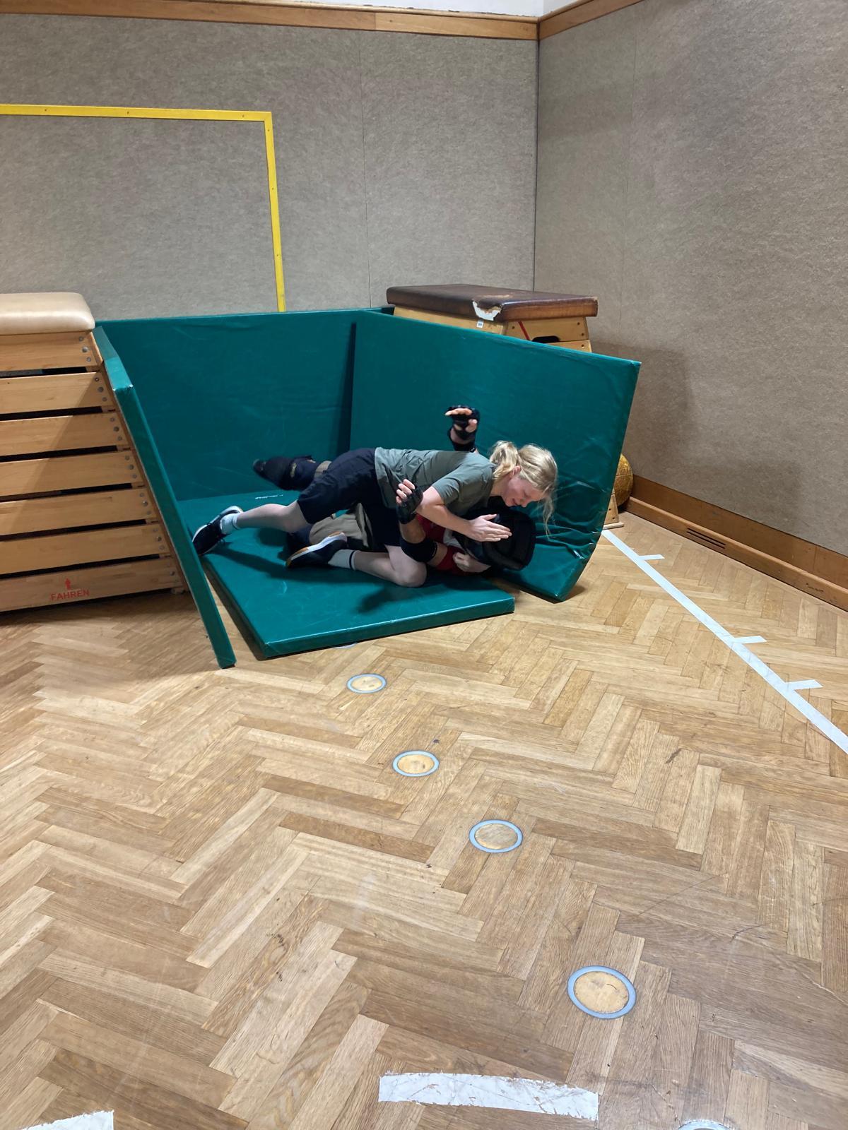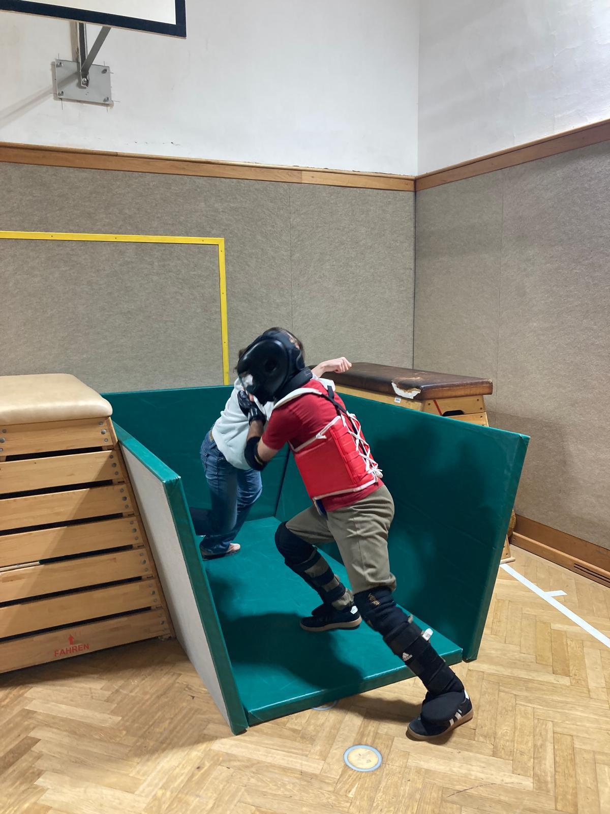 In der letzten Einheit standen die Jugendlichen einem Aggressor in voller Schutzausrüstung gegenüber und mussten sich in einem realitätsnahen Stressszenario behaupten. Dabei war ihnen alles erlaubt, solange sie handlungsfähig blieben und das Gelernte anwenden konnten.