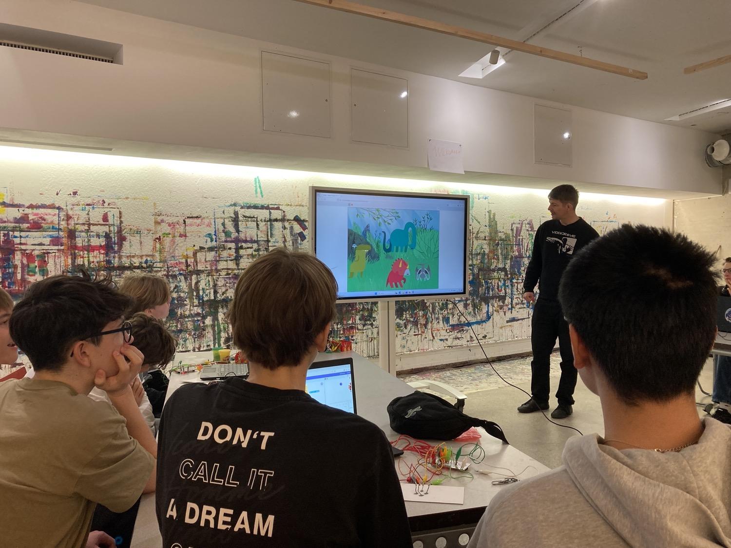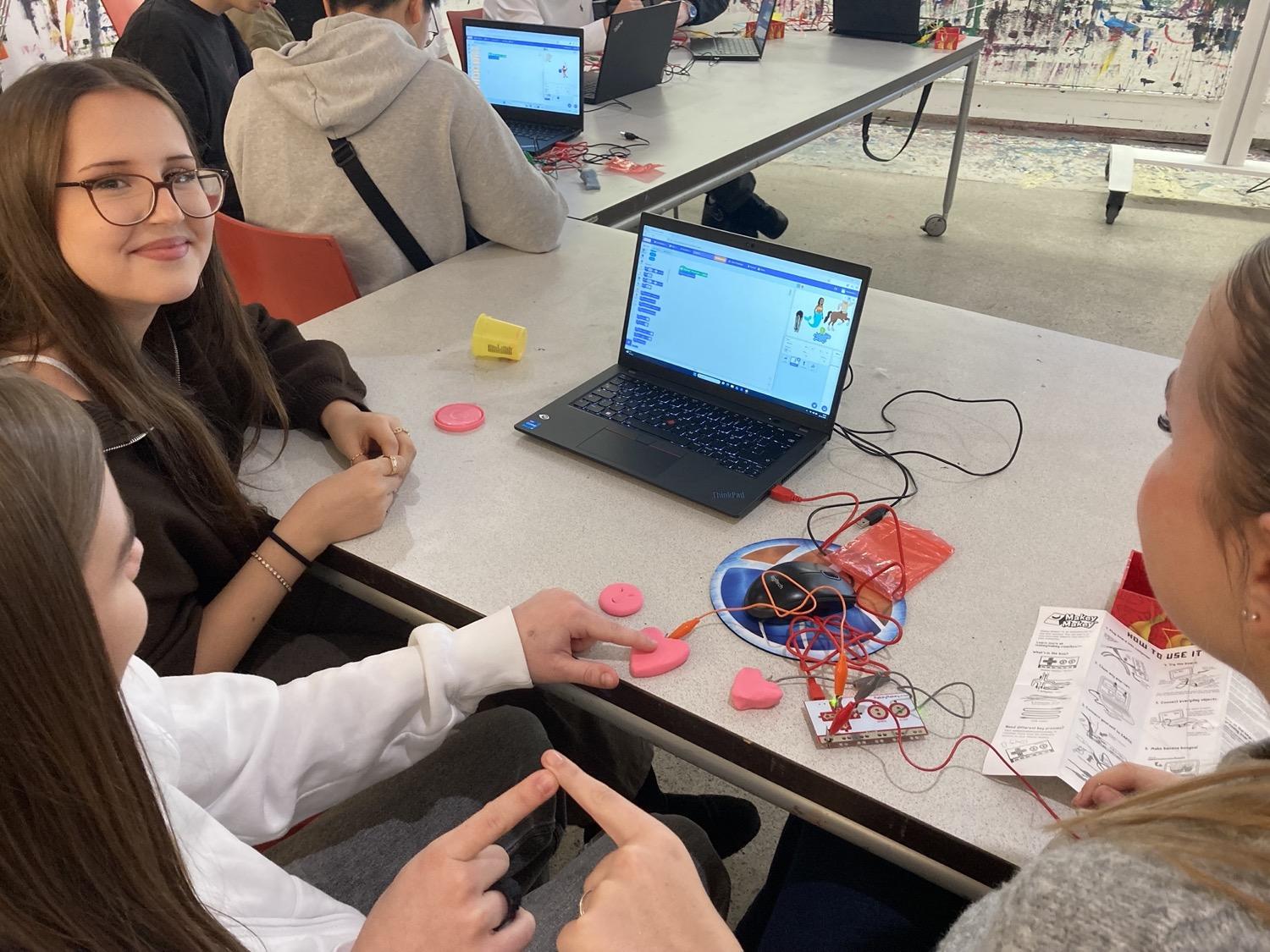 In diesem Workshop haben wir gelernt, Leitfähigkeit, serielle/parallel gedachte Verbindungen und Erdung praxisnah anzuwenden und einen Eindruck davon bekommen, was es heißt, Technologie nicht nur zu konsumieren, sondern zu verstehen und selbst zu gestalten. Auf Basis der Computersprache Scratch konnten wir wesentliche Programmierprinzipien kennenlernen: Variablen, Bedingungen, Schleifen, einfache States & Debugging. Mit interaktiven Eingaben (selbstgestaltete Tasten oder Flächen aus Bleistiftstrichen, Draht und anderen Materialien wie Knete) erfanden wir sozusagen unsere eigene Tastatur, mit der unterschiedliche Aktionen ausgelöst werden konnten. Das Ergebnis war ein funktionsfähiger Prototyp inkl. Kurzpräsentation mittels Feedback und Share Fair.