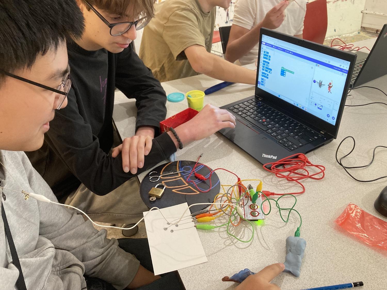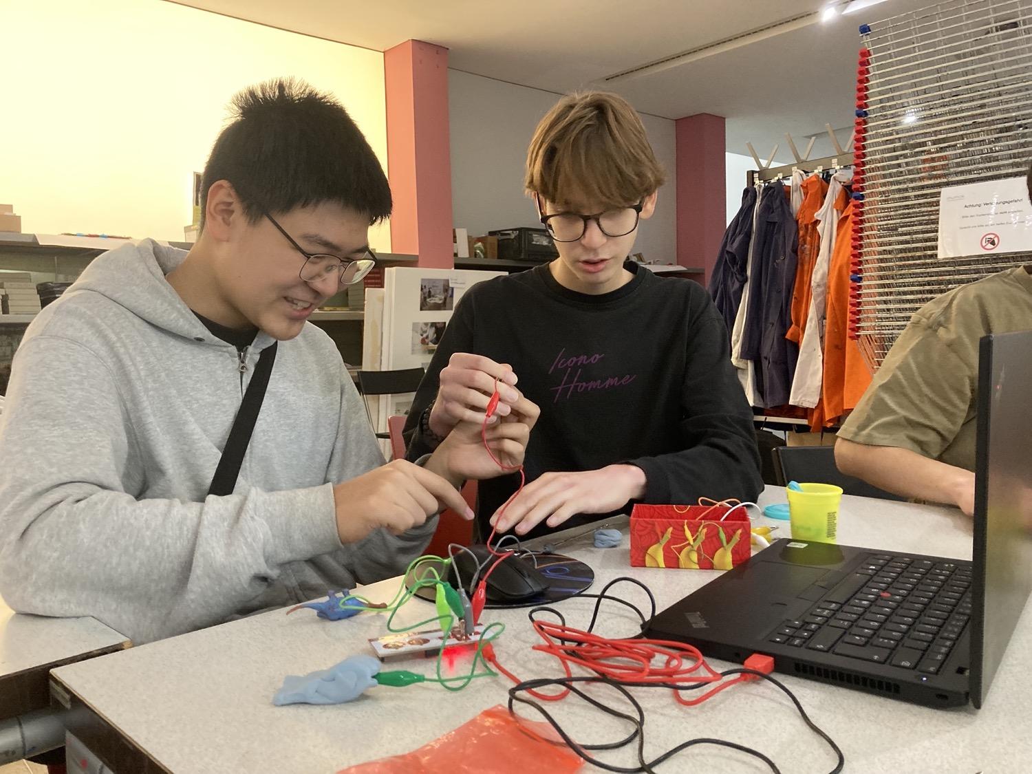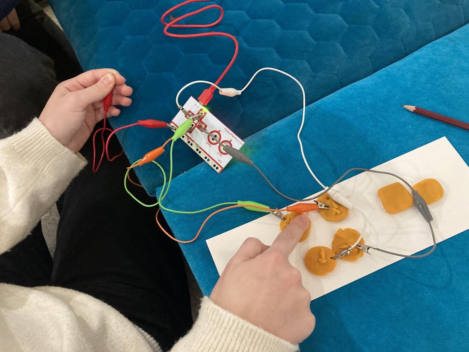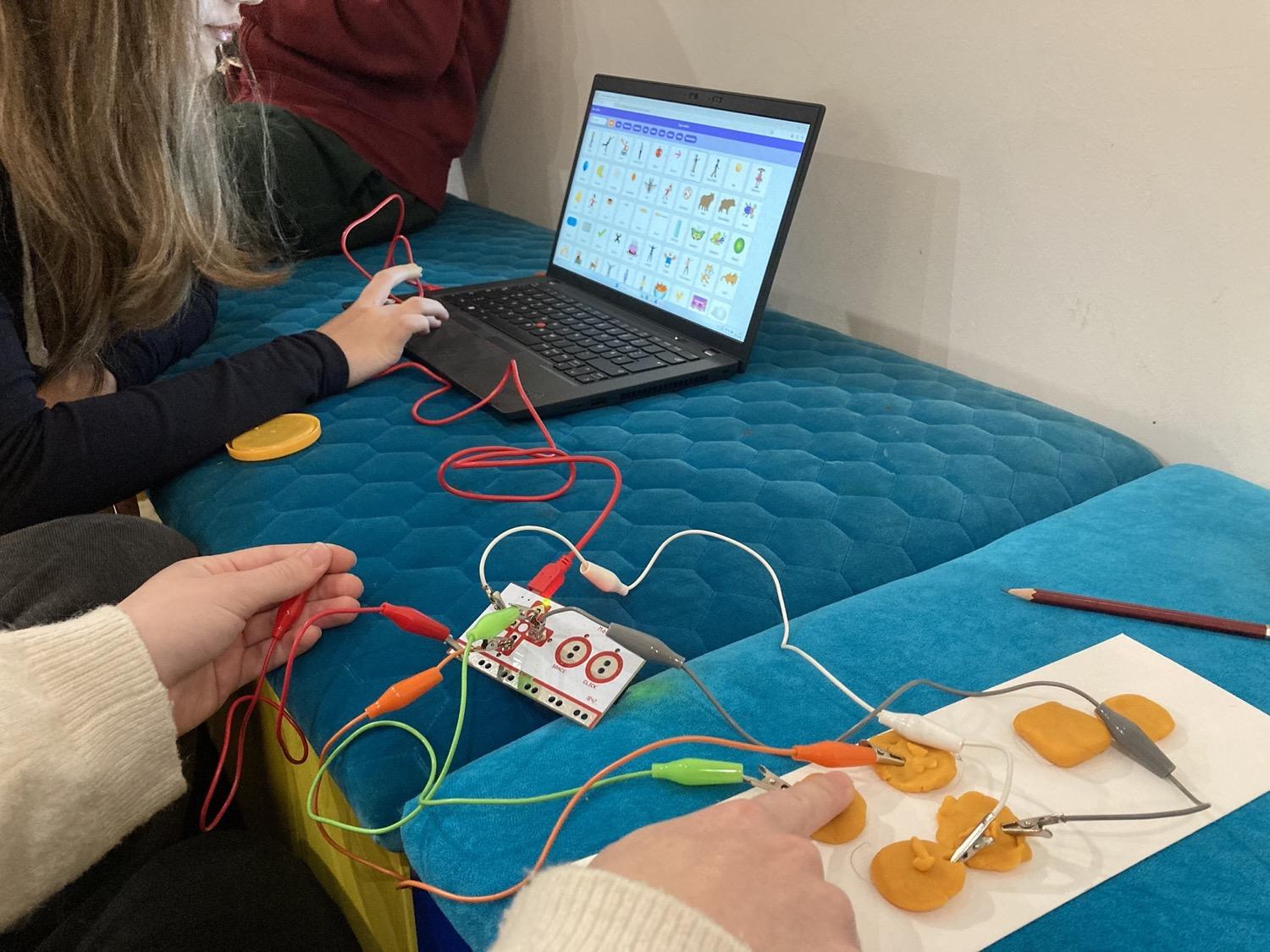 In diesem Workshop haben wir gelernt, Leitfähigkeit, serielle/parallel gedachte Verbindungen und Erdung praxisnah anzuwenden und einen Eindruck davon bekommen, was es heißt, Technologie nicht nur zu konsumieren, sondern zu verstehen und selbst zu gestalten. Auf Basis der Computersprache Scratch konnten wir wesentliche Programmierprinzipien kennenlernen: Variablen, Bedingungen, Schleifen, einfache States & Debugging. Mit interaktiven Eingaben (selbstgestaltete Tasten oder Flächen aus Bleistiftstrichen, Draht und anderen Materialien wie Knete) erfanden wir sozusagen unsere eigene Tastatur, mit der unterschiedliche Aktionen ausgelöst werden konnten. Das Ergebnis war ein funktionsfähiger Prototyp inkl. Kurzpräsentation mittels Feedback und Share Fair.