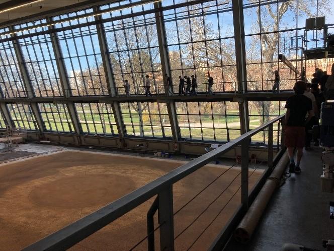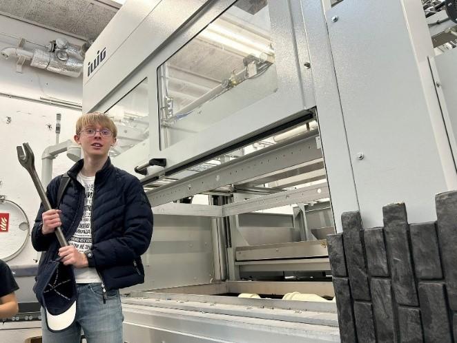 Wir haben uns zuerst vor der Schule getroffen und sind mit der Frau Prof. Haderer hingefahren. Beim Eingang trafen wir eine Frau, die uns durch das Gebäude führte. Allgemein durften wir vieles leider nicht fotografieren, weil die in Bau befindlichen Bühnenbilder vor der Premiere der jeweiligen Stücke von der Öffentlichkeit bewahrt werden müssen, also der Geheimhaltungspflicht unterliegen. Wir besuchten zuerst eine riesige Halle, wo aus Metall, vor allem Aluminium, die Gerüste für die Bühnen gebaut werden. Der Raum war voller Metallkonstruktionen und Maschinen. Danach besichtigten wir die Holzwerkstätten, hier werden Kulissen und Requisite für Theaterstücke gebaut. Kurz später sahen wir, was für viele das Highlight war, der massive 3D-Drucker. Dieser wird für Modelle gebraucht, damit die Künstler und Arbeiter diese anschauen können. Der nächste war der Raum, wo mit Styropor gearbeitet wurde. Das Kunstwerk in der Mitte war eine fast zehn Meter große Statue. Im vorletzten Raum standen wir vor riesigen Tapeten. Eine besondere hatte ein Marmormuster darauf gemalt. Sie waren alle auf dem Boden, um gut zu trocknen. Der letzte Raum war der Raum, wo die fertigen Werkstücke aufbewahrt wurden. Für viele war die Statue das coolste, obwohl es im Raum dank des Styropors nicht allzu gut gerochen hat. Allgemein war der Besuch nicht nur informativ, sondern hat auch ziemlich viel Spaß gemacht.